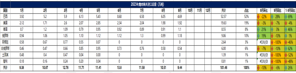 2023 年 9 月中國主港禽肉進口量 9.44 萬噸,環(huán)比減少 10%,同比減少6%。1-9月,中 國主港禽肉進口量101.48萬噸,同比增加 26%。從進口國別看,進口巴西禽肉共計 52.57萬 噸,同比增加 69%,占比 52%。進口美國禽肉 19.63萬噸,同比減少 4%,占比 19%。進口 俄羅斯禽肉 9.86萬噸,同比增加1%,占比 10%。進口泰國禽肉 8.55 萬噸,同比增加46%,占比 8%。從進口品項看,帶骨凍雞塊進口量26.56萬噸,占比 26%。凍雞翼(不包括翼尖) 27.75 萬噸,占比 27%。凍雞爪進口量41.10萬噸,占比 41%。其他凍雞雜碎進口量 6.09 萬噸,占比 6%。從進口金額看,1-9月,中國主港雞肉進口金額共計 32.81億美金,同比增 加 17%。其中,巴西禽肉進口金額 15.16億美金,同比增加57%。美國禽肉進口金額 6.36 億美金,同比下滑 30%。泰國禽肉進口金額3.85億美元,同比增加 47%。俄羅斯禽肉進口金額 3.41億美金,同比增加23%。白俄羅斯禽肉進口金額 2.45 億美金,同比增77%。