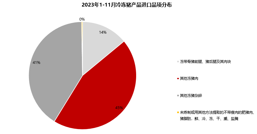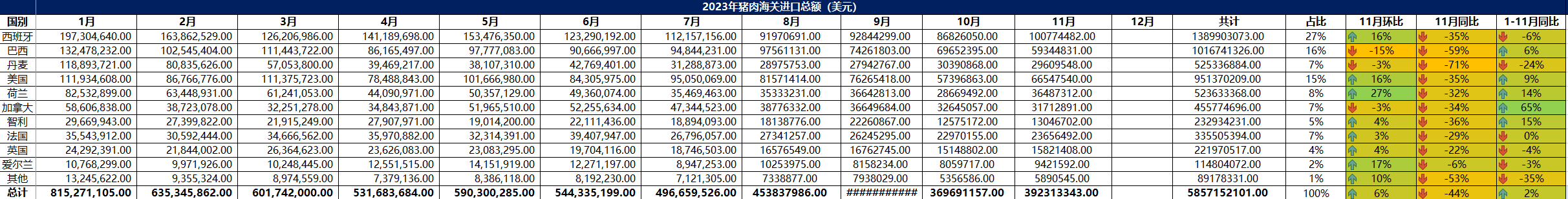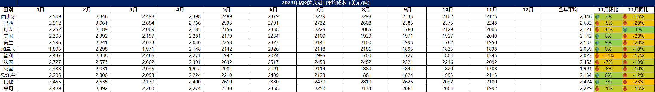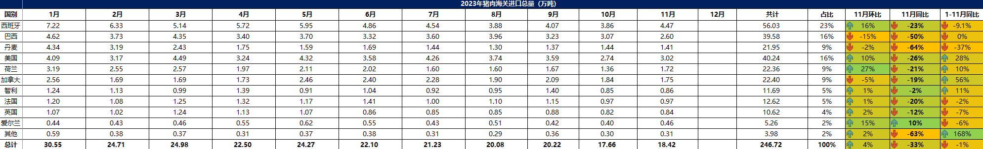 2023 年 11月中國主港豬肉進口量18.42萬噸,環(huán)比上升4%,同比減少33%。1-11月主港豬肉進口量246.72萬噸,同比下降1%。從進口國別看,其中,從西班牙進口豬肉共計56.03萬噸,同比減少 9.1%,占比 23%。從美國進口豬肉共計 40.24萬噸,同比增加28%,占比 9%。從巴西進口豬肉共計39.58萬噸,同比持平,占比16%。從丹麥進口豬肉共計 21.95萬噸,同比減少37%。從進口品項看,1-11月,凍帶骨豬前腿、豬后腿及其肉塊進口量 34.57萬噸,占比 14%。其他凍豬肉進口量110.42萬噸,占比 45%。其他凍豬雜碎101萬噸,占比 41%。豬油脂類進口量僅 0.68萬噸。從 進口金額看,1-11月,主港豬肉進口總額 58.57億美金,同比上漲 2%。其中,進口西班牙 豬肉金額 13.9億美金,同比下降6%。進口巴西豬肉金額10.16億美金,同比上漲 6%。進口美國豬肉金額 9.51億美金,同比上漲9%。進口丹麥豬肉金額 5.25億美金,同比減少24%。