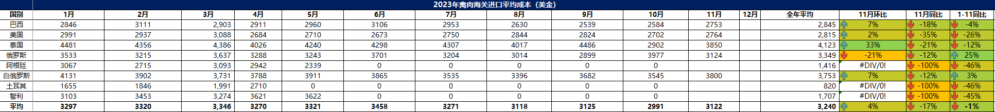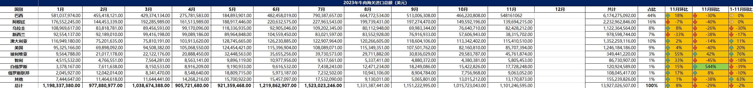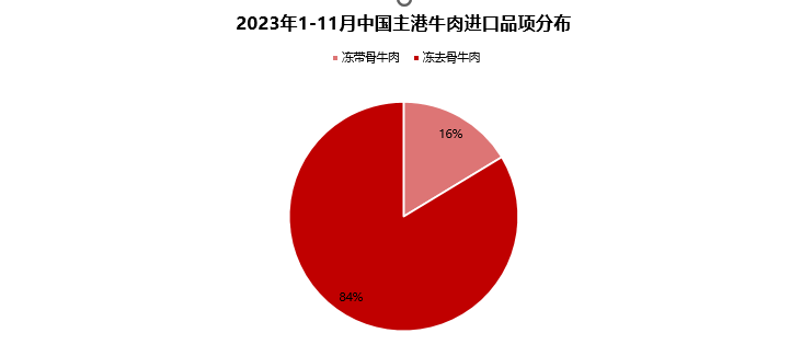 2023 年 11月中國主港牛肉進口量22.92萬噸,環(huán)比上升5%,同比減少 7%。1-11月, 中國主港牛肉進口總量 243.71萬噸,同比增加 2%。從進口國別看,進口巴西牛肉105.6萬 噸,同比下降6%,占比 43%。進口阿根廷牛肉48.27萬噸,同比增加 9%,占比 20%。進口烏拉圭牛肉25.17萬噸,同比減少6%,占比 10%。進口新西蘭牛肉 18.14萬噸,同比下降20%,占比 7%。進口澳大利亞牛肉 18.24萬噸,同比增加24%,占比 7%。從進口品 項看,凍去骨牛肉進口總量203.89萬噸,占比 84%。凍帶骨牛肉進口總量 39.81萬噸,占比 16%。從進口金額看,1-11月,中國主港牛肉進口金額共計 139.27億美金,同比減少 2%。其中,巴西牛肉進口金額 61.74億美金,同比持平。阿根廷牛肉進口金額22.33億美金, 同比持平。澳大利亞牛肉進口金額13.53億美金,同比增加11%。烏拉圭牛肉進口金額11.22 億美金,同比減少 30%。新西蘭牛肉進口金額9.79億美金,同比減少17%。