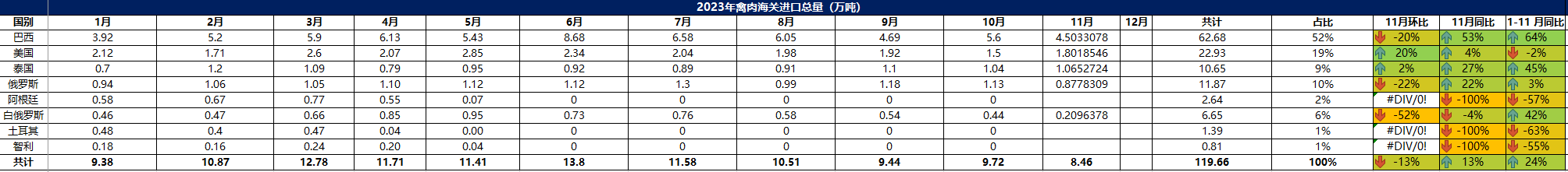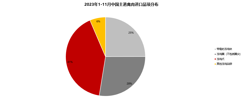 2023 年 11月中國主港禽肉進口量 8.46萬噸,環(huán)比下降13%,同比增加13%。1-11月,中國主港禽肉進口量119.66萬噸,同比增加 24%。從進口國別看,進口巴西禽肉共計 62.68萬 噸,同比增加 64%,占比52%。進口美國禽肉 22.93萬噸,同比減少 2%,占比 19%。進口俄羅斯禽肉 11.87萬噸,同比上漲3%,占比 10%。進口泰國禽肉10.65萬噸,同比增加45%,占比 9%。從進口品項看,帶骨凍雞塊進口量29.87萬噸,占比 25%。凍雞翼(不包括翼尖)33.01 萬噸,占比 28%。凍雞爪進口量49.14萬噸,占比 41%。其他凍雞雜碎進口量 7.66 萬噸,占比 6%。從進口金額看,1-11月,中國主港雞肉進口金額共計38.5億美金,同比增 加 11%。其中,巴西禽肉進口金額17.96億美金,同比增加47%。美國禽肉進口金額 7.48億美金,同比下滑 29%。泰國禽肉進口金額4.75億美元,同比增加 40%。俄羅斯禽肉進口金額 4.04億美金,同比增加20%。白俄羅斯禽肉進口金額 2.69 億美金,同比增49%。