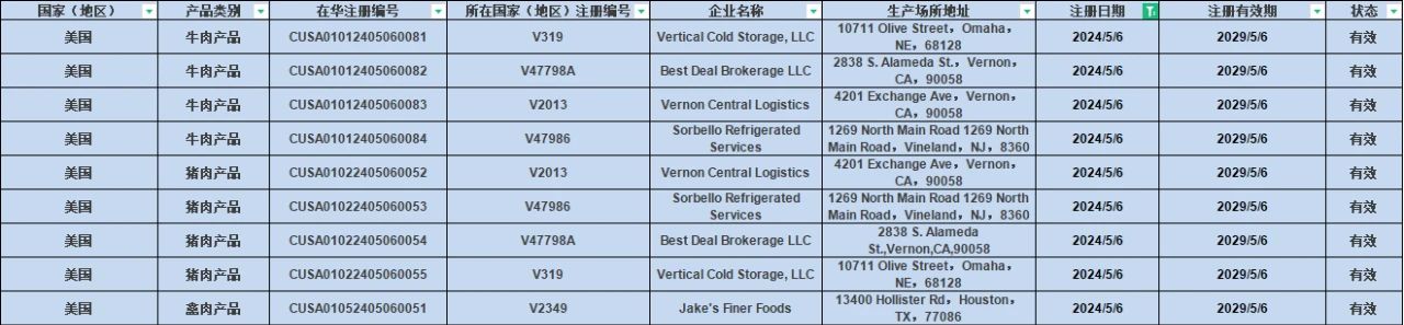 2024年5月6日新增美國9家肉類產(chǎn)品企業(yè),其中:
