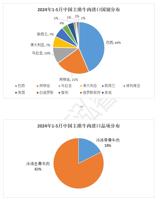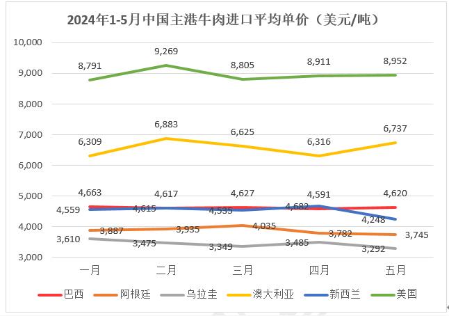 從進(jìn)口單價看,巴西1-5月平均單價為4627美元/噸,去年同期為5232美元/噸,阿根廷1-5月平均單價為3879美元/噸,去年同期為4215美元/噸,烏拉圭1-5月平均單價為3460美元/噸,去年同期為4120美元/噸,美國1-5月平均單價為8927美元/噸,去年同期為8421元/噸。各國進(jìn)口平均單價為4633美元/噸,去年同期為5188美元/噸。總體來看,牛肉進(jìn)口單價同比均呈下降趨勢。
